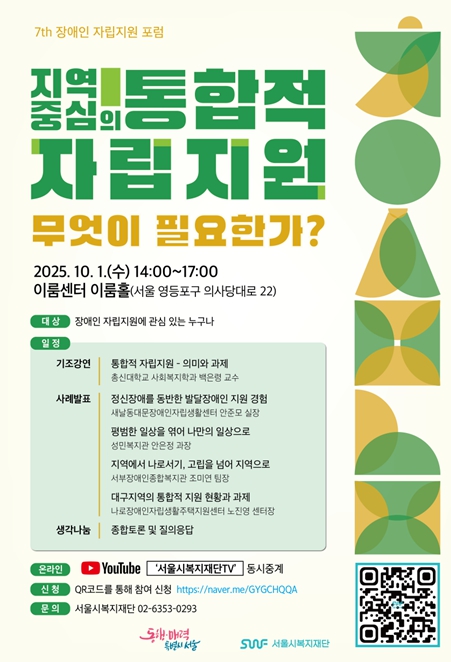 포럼은 온오프라인으로 동시에 진행되며, 재단 유튜브 채널 ‘서울시복지재단TV’를 통해 누구나 시청할 수 있다. 수어통역도 실시간으로 제공될 예정이며, 참여자는 포스터 내 QR코드 또는 링크를 통해 9월 28일까지 사전 모집한다.
