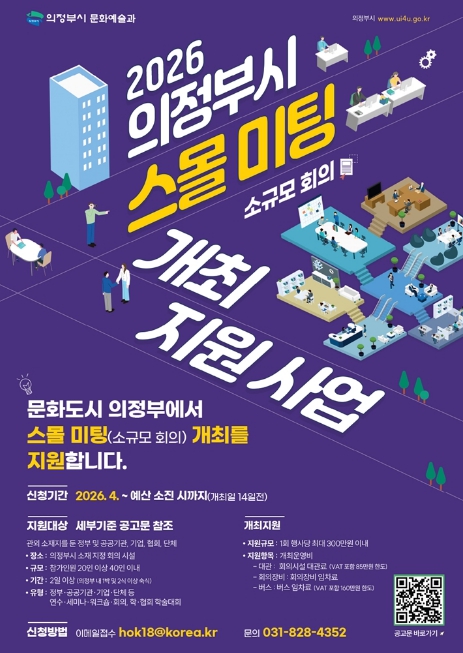 [파이낸셜경제=김기보 기자] 의정부시는 관외에 소재지를 둔 기관 및 단체 등을 대상으로 ‘2026 의정부시 스몰미팅(소규모 회의) 개최 지원사업’을 추진한다.
