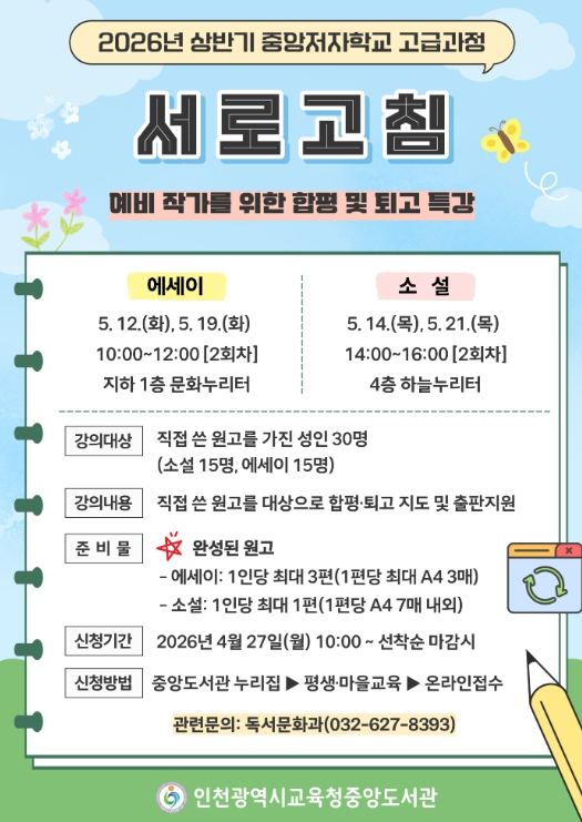 [파이낸셜경제=김기보 기자] 인천광역시교육청중앙도서관은 4월 27일부터 예비 작가를 위한 ‘중앙저자학교 고급과정’ 참여자를 모집한다.