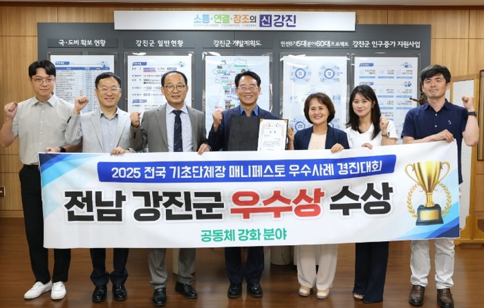 [파이낸셜경제=김예빈 기자] 강진군이 2025년 매니페스토 우수사례 경진대회에서 공동체강화 부문에서 ’우수상’을 수상하며 ‘청년의 미래를 만드는 희망공간’이라는 비전을 실천한 혁신 성과를 대내외에 널리 알렸다.