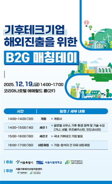 서울시는 2023년 지자체로서는 처음으로 기후테크 컨퍼런스를 개최하며 기후테크 기업과 소통해 왔다. 이번 매칭데이는 지난 10월 개최한 기후테크 컨퍼런스에 참여한 기업들의 해외진출 애로사항을 청취, 지원 방안을 모색하는 과정에서 추진됐다.