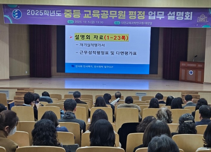 [파이낸셜경제=김영란 기자] 대전시교육청은 12월 5일, 8일 양일간 대전교육과학연구원에서 중·고·각종·특수학교 교감과 교사, 교육전문직원을 대상으로 2025학년도 중등 교육공무원 평정 업무 설명회를 개최했다.