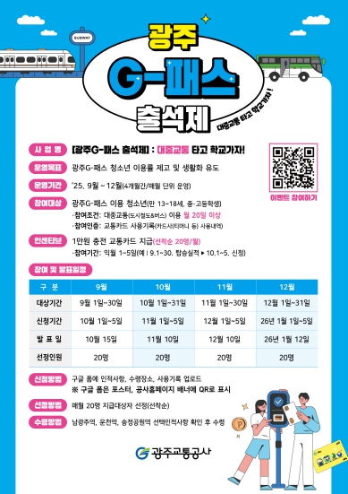 [파이낸셜경제=김예빈 기자] 광주교통공사가 오는 9월부터 12월까지 4개월 동안 지역 청소년을 대상으로 ‘광주G-패스 출석’ 이벤트를 펼친다.