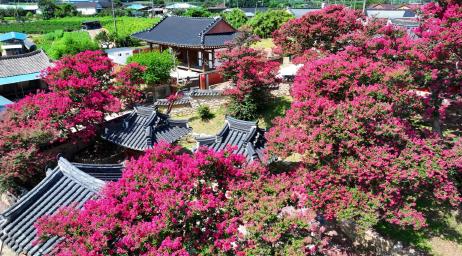 [파이낸셜경제=김예빈 기자] 짙푸른 하늘 아래 붉게 피어난 배롱나무 꽃이 고택의 지붕을 감싸 안는다. 정읍시 태인면 서현사지에 여름이 물들었다.