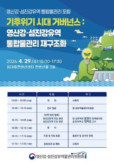 [파이낸셜경제=김예빈 기자] 영산강ㆍ섬진강유역물관리위원회는 유역 주요 물관리 현안에 대한 이해관계자 및 전문가의 다양한 의견수렴과 논의를 위하여 '기후위기 시대 거버넌스 : 영산강ㆍ섬진강유역 통합물관리 재구조화'포럼을 4월 29일(수) 김대중컨벤션센터에서 개최한다고 밝혔다.