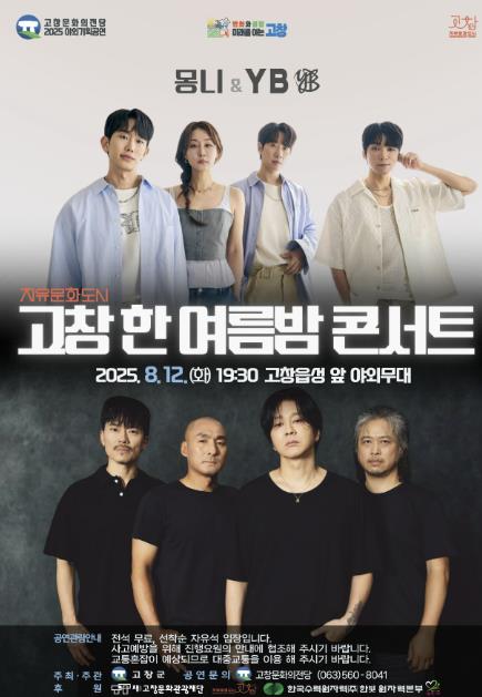 [파이낸셜경제=김예빈 기자] 고창군이 오는 12일 저녁 7시30분 고창읍성 잔디광장에서 YB(윤도현밴드), 몽니를 초청한 ‘고창 한 여름밤 콘서트’를 연다.