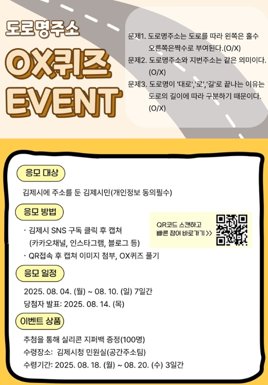 [파이낸셜경제=김예빈 기자] 김제시는 도로명주소에 대한 시민들의 관심과 이해를 높이고 올바른 주소 사용을 장려하기 위해 오는 4일부터 10일까지 도로명주소 OX퀴즈 이벤트를 실시한다고 밝혔다.
