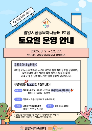 [파이낸셜경제=김예빈 기자] 경남 밀양시는 맞벌이 가정 등 평일 이용이 어려운 시민들의 수요를 반영해 공동육아나눔터의 주말 운영을 8월부터 확대한다고 1일 밝혔다.