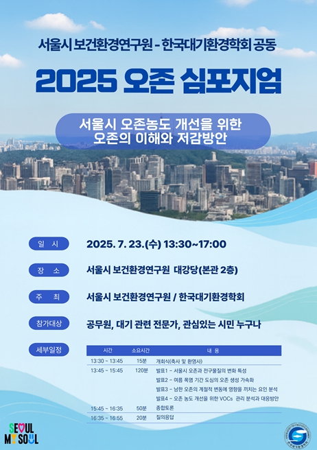 서울시보건환경연구원은 오는 7월 23일 오후 1시 30분, 연구원 대강당에서 '2025년 오존 심포지엄'을 개최한다고 밝혔다. 이번 심포지엄은 ‘오존의 이해와 저감방안’을 주제로 하며, 서울시와 (사)한국대기환경학회가 공동 주최한다.