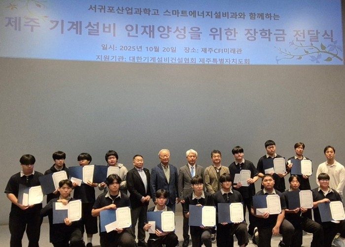 [파이낸셜경제=김영란 기자] 제주도교육청 서귀포산업과학고등학교는 20일 제주에너지공사에서 대한기계설비건설협회 제주특별자치도회로부터 스마트에너지설비과 학생들을 위한 장학금을 860만원을 전달받았다.