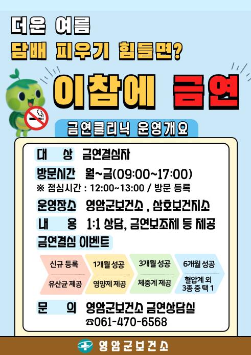 [파이낸셜경제=김예빈 기자] 영암군보건소가 ‘더운 여름, 담배 피우기 힘들면? 이참에 금연’을 구호로 금연클리닉 홍보에 들어갔다.