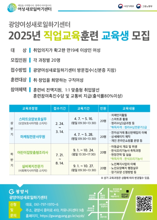 자세한 사항은 광양여성새로일하기센터 또는 광양시 누리집을 통해 확인할 수 있다.