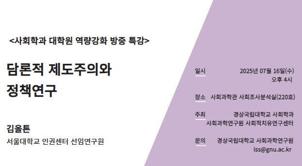 이 강연회는 경상국립대학교 사회과학관 사회조사분석실(151동 220호)에서 개최되며, 사회과학연구원에 전화 또는 전자우편으로 문의해 참여할 수 있다.