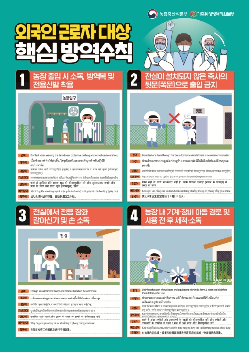 정비된 외국인 근로자와 고용 농장주를 대상으로 다국어로 된 방역수칙 홍보 리플릿 배부 및 문자 발송, 외국인 근로자용 영상 등을 활용하여 방역 교육을 실시하고, 아프리카돼지열병 등 가축전염병 현장 방역 점검에서 외국인 근로자 고용 농장에 대해 외국인 근로자 신고 사항과 방역관리 등을 중점 점검할 방침이다.
