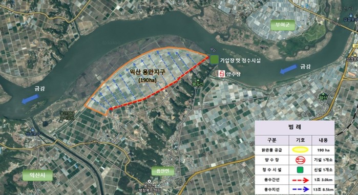 '용수공급 체계 구축사업'은 올해부터 2030년까지 총사업비 120억 원(국비 96억 원 포함)을 투입해, 정수장과 배수관로를 설치하고 금강물을 용안지구 190헥타르(㏊)에 공급하는 사업이다.