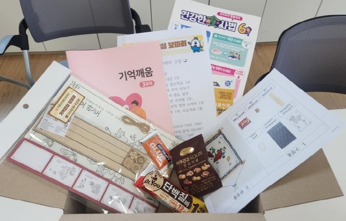 ‘기억안심보따리’는 인지 학습지와 스트레칭 밴드, 칠교 및 만들기 키트 등을 통해 어르신들의 지남력, 주의 집중력, 기억력, 실행 기능을 훈련할 수 있도록 구성되어 있다.