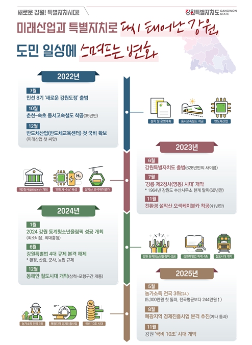 또한 2023년에는 강원특별자치도가 출범하고 이듬해에는 산림·환경·농업·군사 등 4대 규제가 본격 해제되는 토대를 마련했다.