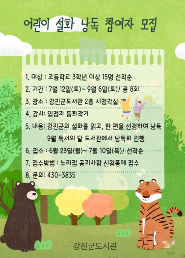 [파이낸셜경제=김예빈 기자] 강진군도서관이 오는 7월 12일부터 9월 6일까지 매주 토요일 전남도립도서관에서 주최하는 찾아가는 지역작가 ‘어린이 설화낭독’을 운영한다.