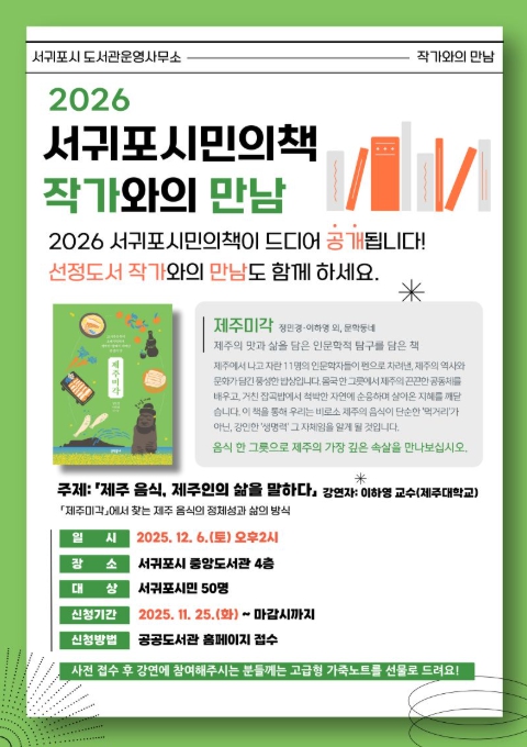 [파이낸셜경제=김영란 기자] 서귀포시는 12월 6일 오후 2시, 서귀포시 중앙도서관에서 2026년 서귀포시민의 책으로 선정된 '제주미각'의 저자 이하영 교수를 초청해 작가와의 만남을 운영한다.