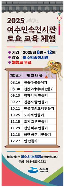 [파이낸셜경제=김예빈 기자] 여수시는 8월 16일부터 12월 27일까지 매월 토요일 2일, 총 10일간 여수민속전시관에서 ‘토요 교육 체험’을 운영한다.