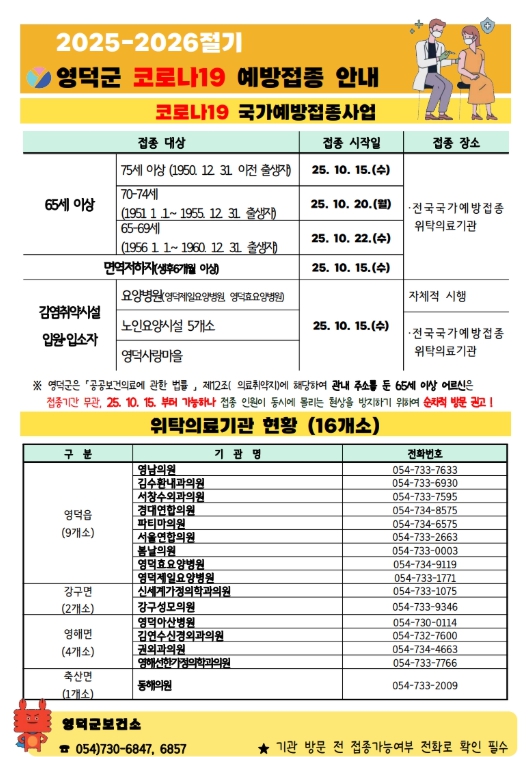 접종 장소는 주소지와 관계없이 전국 국가예방접종 위탁의료기관이며, 관내 병・의원은 16개소로, 영덕군 보건소 홈페이지 또는 예방접종 도우미 누리집에서 확인할 수 있다.