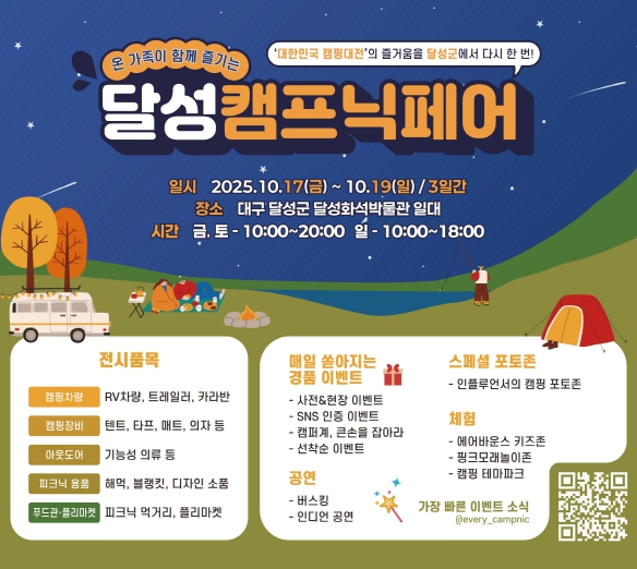 [파이낸셜경제=김지훈 기자] 달성군은 오는 17일부터 19일까지 달성화석박물관 앞 광장에서 캠핑용품 전시·판매와 캠핑 문화를 체험할 수 있는 ‘달성캠프닉페어’를 개최한다고 밝혔다.