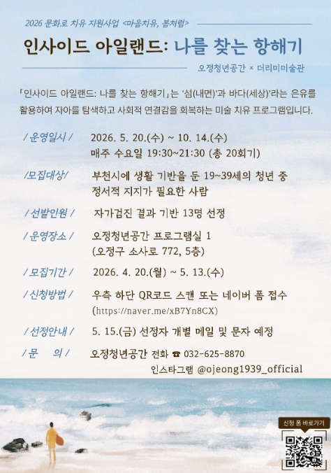 [파이낸셜경제=김기보 기자] 부천시는 오정청년공간에서 정서적 고립감을 겪는 청년을 위한 미술 치유 프로그램 ‘인사이드 아일랜드: 나를 찾는 항해기’ 참여자를 5월 13일까지 모집한다.
