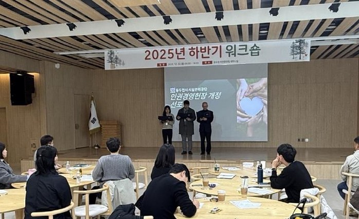 [파이낸셜경제=김기보 기자] 동두천시 시설관리공단은 지난 22일 동두천 자연휴양림 세미나실에서 열린 2025년 하반기 워크숍에서 인권경영 헌장 개정 및 선포식을 개최했다고 밝혔다.