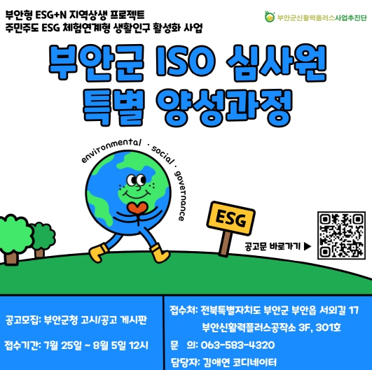 [파이낸셜경제=김예빈 기자] 부안군 신활력플러스사업추진단은 2025년 8월 9일부터 31일까지 매주 주말 총 4개 과정의 ‘ISO 국제공인심사원 특별 양성과정’을 부안읍 소재 ‘신활력공작소(서외길 17)’ 운영하며, 교육 참가자를 오는 8월 5일 낮 12시까지 모집한다고 밝혔다. 이번 교육은 부안형 ESG+N 지역상생 프로젝트의 일환으로 추진되며, 주민주도의 ESG 실천 기반을 강화하고 지역 기반의 ESG 전문 인력을 육성하기 위해 마련됐다.