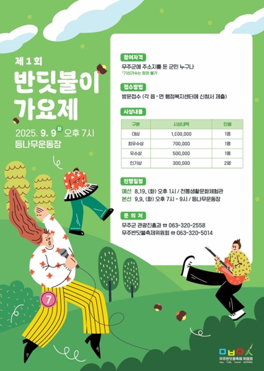 [파이낸셜경제=김예빈 기자] 무주 반딧불이 가요제가 무주군민 화합 축제로 제29회 무주반딧불축제에서 부활한다. 9월 9일 제29회 무주반딧불축제장(등나무운동장 주무대)에서 개최될 예정으로 무주반딧불축제위원회는 오는 8월 8일까지 참가 신청을 받는다.