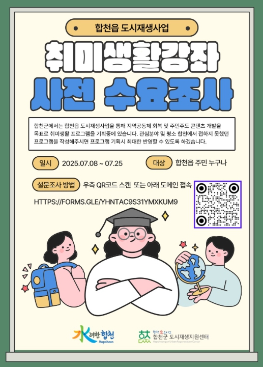 [파이낸셜경제=김예빈 기자] 합천군 도시개발허가과(과장 김석원)는 합천읍 도시재생사업의 일환으로 2025년 합천읍 주민역량강화 지원사업의 ‘취미생활강좌’ 운영에 앞서, 주민들의 관심 분야와 수요를 파악하기 위한 사전 수요조사를 7월 8일부터 25일까지 실시한다.