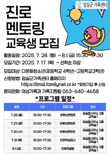 | ▲ 임실군가족센터, 진로 컨설팅 프로그램 참여자 모집 |