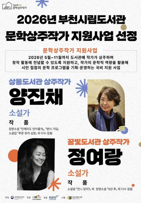 이번 사업은 도서관에 작가가 상주하며 창작 활동을 이어가고, 이를 바탕으로 시민 참여형 문학 프로그램을 기획·운영하는 국비 지원사업이다. 부천시를 대표하는 상주작가로는 상동도서관의 양진채 작가와 꿈빛도서관의 정여랑 작가가 선정됐다.