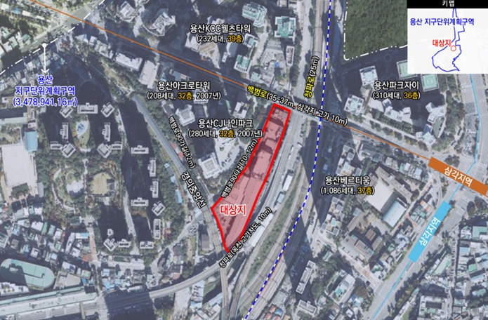 대상지는 4‧6호선 삼각지역 환승역세권으로 용산 광역중심에 입지해 있으며 현재는 오리온 공장부지로 사용되고 있다. 대상지 주변은 전자상가와 국제업무지구, 캠프킴 부지, 용산공원 등이 입지하는 등 향후 획기적인 변화가 예상되는 지역이다. 시는 이러한 대상지 특성을 고려해, 삼각지 역세권 보행네트워크 활성화 및 업무·상업·주거의 복합거점 조성으로 지역활성화를 도모하고자 한다.