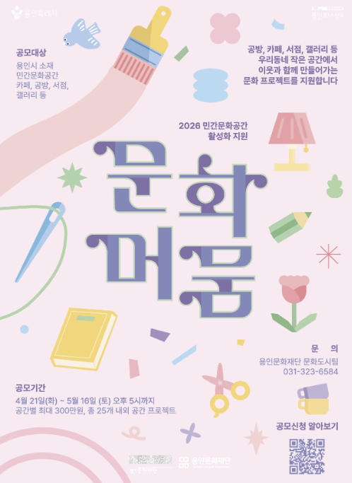 [파이낸셜경제=김기보 기자] 용인문화재단은 오는 5월 16일까지 ‘민간문화공간 활성화 지원사업 '문화머뭄'’의 참여 공간을 모집한다고 밝혔다. 지난해 25개소 공간에서 203회의 프로그램을 운영하며 2,101명의 시민 참여를 이끌어낸 ‘문화머뭄’ 사업은 올해 재단 자체 재원을 매칭하여 총 25개소의 민간문화공간을 선정하고, 공간별 최대 300만 원까지 프로젝트 운영비를 지원할 예정이다.