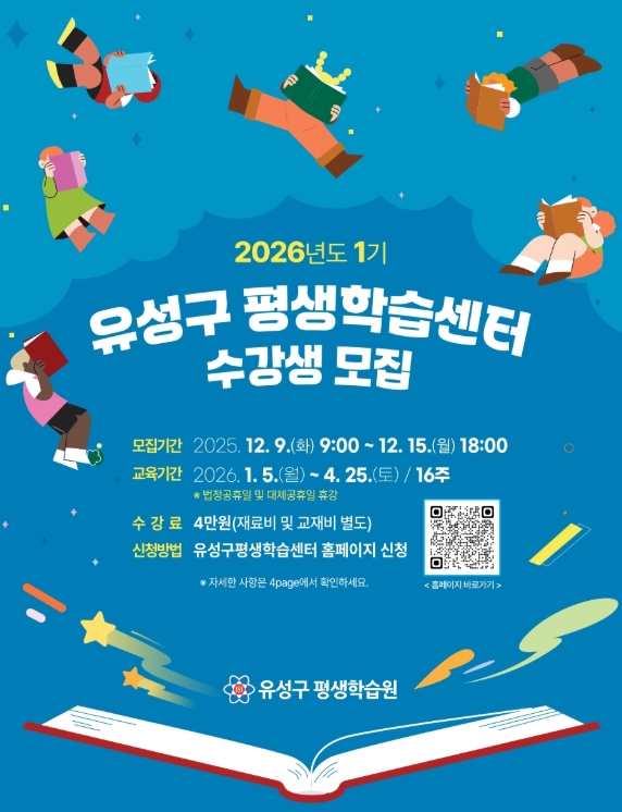 [파이낸셜경제=김영란 기자] 대전 유성구는 오는 9일부터 15일까지 구암평생학습센터와 전민평생학습센터에서 운영하는 ‘2026년도 1기 평생학습센터’ 수강생을 모집한다.