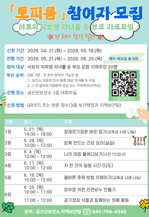 [파이낸셜경제=김영란 기자] 금산군보건소는 아토피 피부염 자녀를 둔 부모의 정서적 지지와 올바른 건강관리 역량 강화를 위해 5월 19일까지 부모 자조모임 ‘토피룸’ 참여자를 모집한다.
