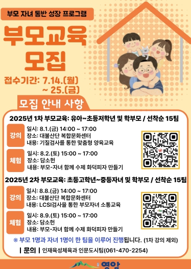 [파이낸셜경제=김예빈 기자] 영암군은 여름방학을 맞아 부모와 자녀가 함께하는 ‘2025년 부모교육’ 참가자를 이달 25일까지 선착순 모집한다.