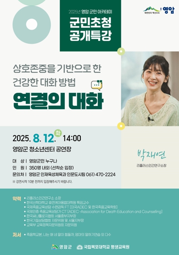 [파이낸셜경제=김예빈 기자] 영암군이 12일 오후 2시 영암군청소년센터에서 박재연 대화훈련가를 초청해 ‘연결의 대화’를 주제로 특강을 진행한다.