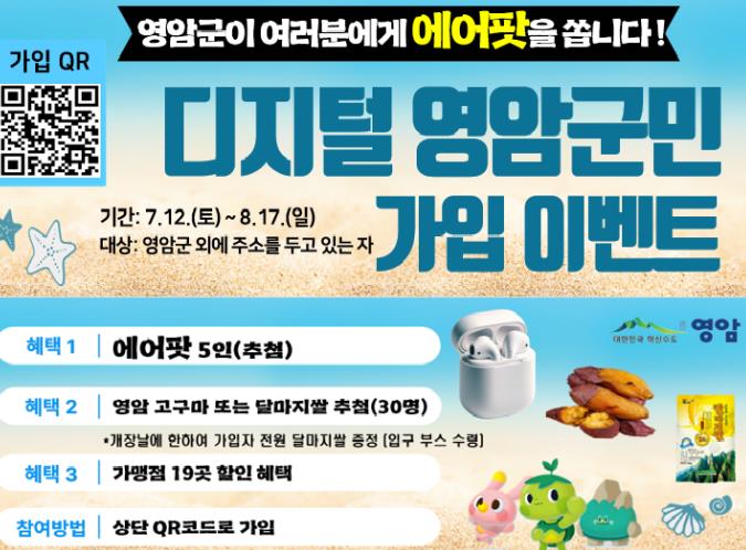 이달 12일 개장해 8/17일까지 운영되는 월출산기찬랜드 개장기간 디지털 영암군민에 가입하면 추첨을 거쳐 푸짐한 선물을 제공한다.
