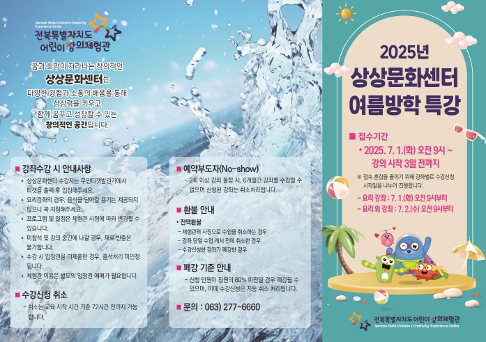 프로그램 접수 및 강좌에 대한 자세한 사항은 어린이창의체험관 누리집(jbchild.kr) 내 체험교육(상상문화센터) 페이지를 통해 확인할 수 있으며, 강의 시작일 3일 전까지 온라인 예약이 가능하다.