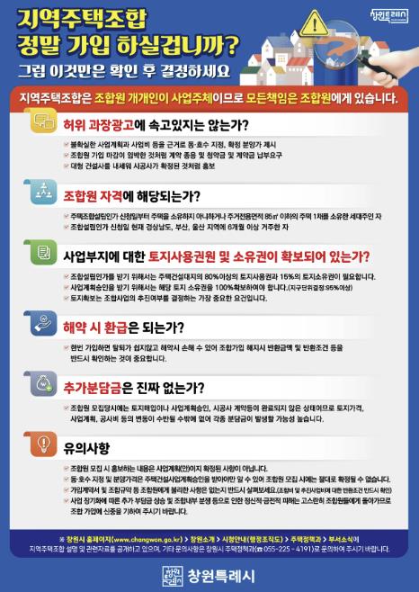이에 창원특례시는 시민들에게 조합 가입 전 ▲토지 소유 및 사용권 확보 상태 확인 ▲계약서·조합규약 내 환불 조건 및 불리 조항 면밀 검토 ▲확정되지 않은 사업계획(안)임을 인지하고 무리한 투자 자제 ▲조합 운영의 투명성 확보를 위한 정보공개 요구 및 권리 행사 등에 대한 사항을 반드시 확인할 것을 권고했다.