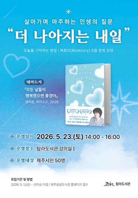 [파이낸셜경제=김영란 기자] 제주시 탐라도서관은 삶과 글을 통해 현대인의 일상 속에서 행복을 발견하고, 스스로를 돌보는 방법을 제시하기 위해 5월 북토리 강연을 운영한다.