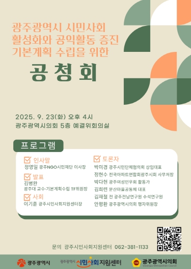 [파이낸셜경제=김예빈 기자] 광주광역시는 23일 오후 4시 광주광역시의회 5층 예결위회의실에서 ‘광주광역시 시민사회 활성화와 공익활동 증진을 위한 기본계획(제1차, 2026~2028)’ 최종보고회 겸 공청회를 개최한다.