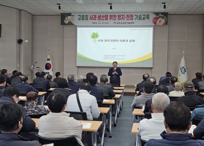 [파이낸셜경제=김지훈 기자] 성주군은 12월 17일, 농업기술센터 2층 대강당에서 관내 사과재배 농가 100여명을 대상으로『고품질 사과 생산을 위한 정지·전정 기술교육』을 실시했다.