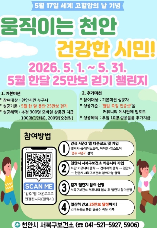 [파이낸셜경제=김영란 기자] 천안시 서북구보건소는 5월 한 달간 ‘움직이는 천안, 건강한 시민!’ 걷기 챌린지를 운영한다고 20일 밝혔다.