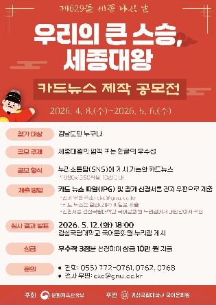 [파이낸셜경제=김예빈 기자] 경상국립대학교 국어문화원은 제629돌 세종 나신 날(5월 15일)을 기념하여 ‘우리의 큰 스승, 세종대왕 카드뉴스 제작 공모전’을 개최한다.