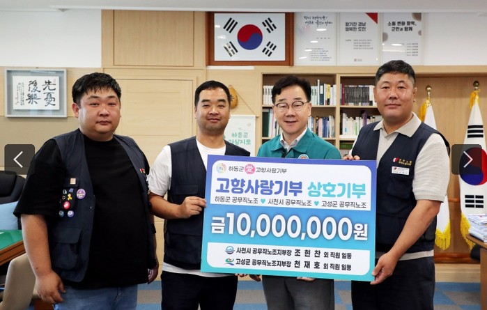 이날 기부금은 사천시 조현찬, 고성군 천재호 민주노총 일반노조 공무직지회 지회장이 대표로 하동군 집무실을 찾아 직접 전달했다.