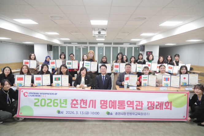 춘천시는 13일 시청 민방위교육장에서 ‘2026 춘천시 명예통역관 위촉식 및 정례회’를 열고 명예통역관 38명을 위촉했다. 이 가운데 17명은 지난해에 이어 재위촉됐다.