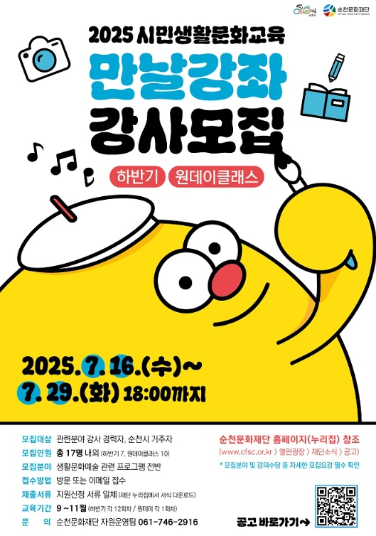 [파이낸셜경제=김예빈 기자] (재)순천문화재단은 시민들의 생활문화예술 활동을 장려하고 지원하기 위해 2025년 시민생활문화교육 「만날강좌」 강사를 오는 29일 오후 6시까지 모집한다.